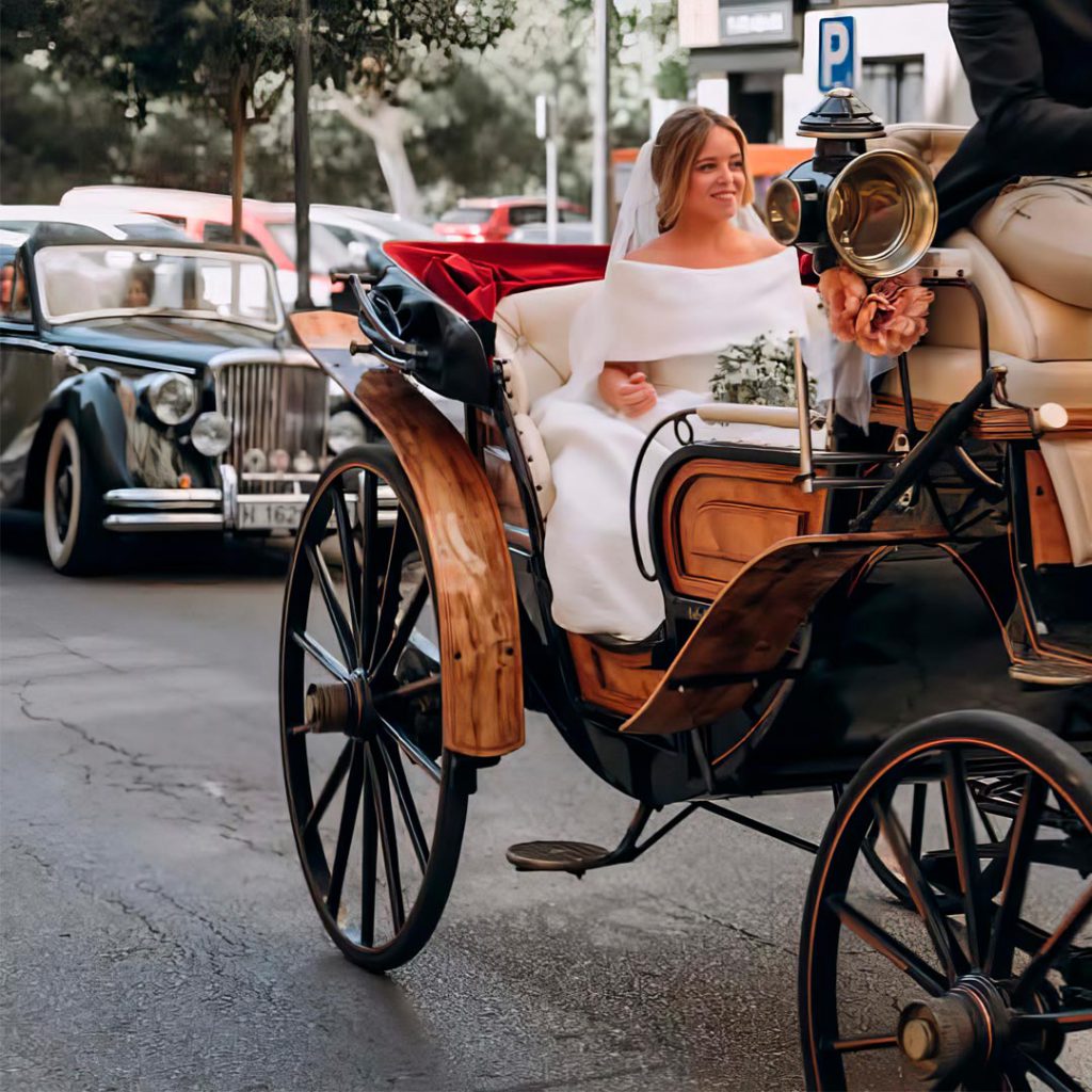 La vestimenta de los cocheros y la decoración del carruaje están a disposición de los protagonistas del evento, permitiendo una personalización que respeta la sutileza y el buen gusto. Este enfoque asegura que cada paseo sea no solo elegante, sino también una expresión de refinamiento y delicadeza, creando una atmósfera de distinción y clase sin igual.