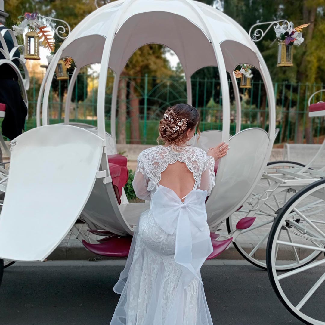 Inspirado en la emblemática carroza de la película «Cenicienta» y meticulosamente elaborado a mano, su diseño rememora la célebre calabaza transformada en carroza por el hada madrina. Este modelo semicerrado, con asientos y detalles en color malva, es ideal para bodas, comuniones, cabalgatas, photocalls y sesiones fotográficas, proporcionando una atmósfera de ensueño y romance.