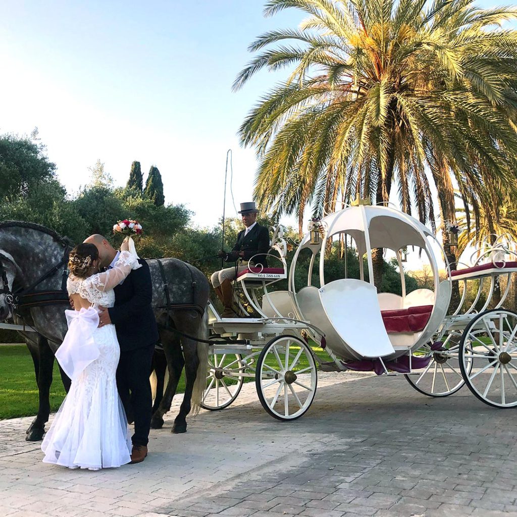 Los caballos adornados con detalles de fantasía y una decoración acorde con la temática convierten el carruaje en el vehículo perfecto para cualquier evento de ensueño.